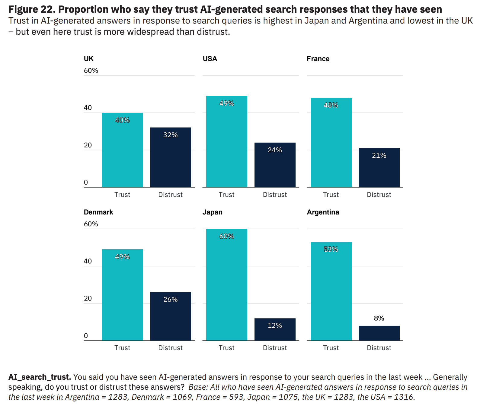 Het vertrouwen in AI-gegenereerde zoekresultaten (AI-overzichten in Google) is relatief hoog. 50 procent van alle ondervraagden zegt deze te vertrouwen; 20 procent zegt deze niet te vertrouwen.