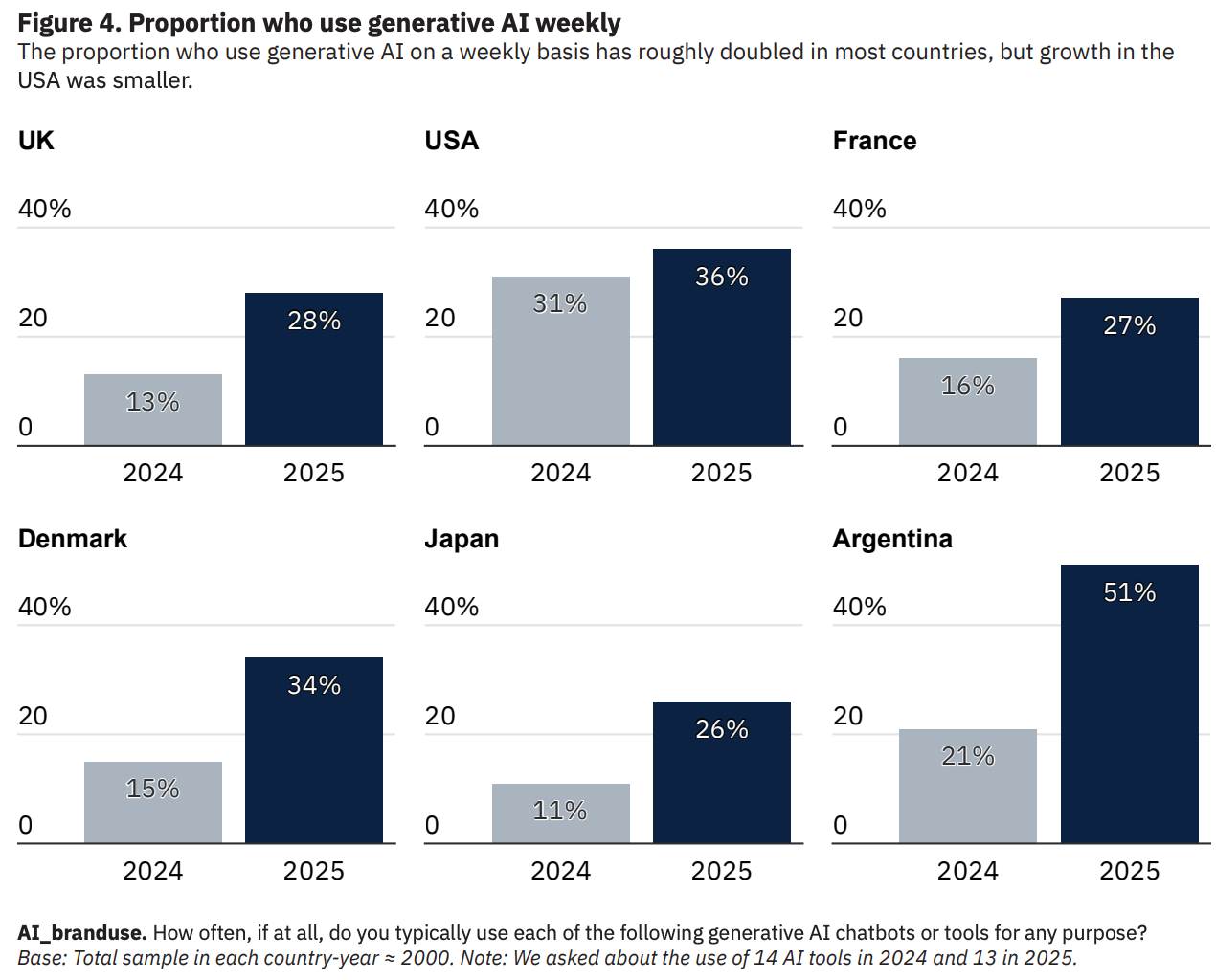 De cijfers van vorig jaar lieten zien dat het gebruik van generatieve AI sterk verschilt tussen landen. De VS liep voor en daar gebruikten gemiddeld twee keer zoveel mensen generatieve AI als in andere landen. In een jaar tijd is het gebruik in de andere landen meer dan verdubbeld, terwijl de groei in de VS veel lager is. De verschillen zijn daarmee een stuk kleiner geworden. Het is aannemelijk dat ook in Nederland het gebruik van generatieve AI verdubbeld is.