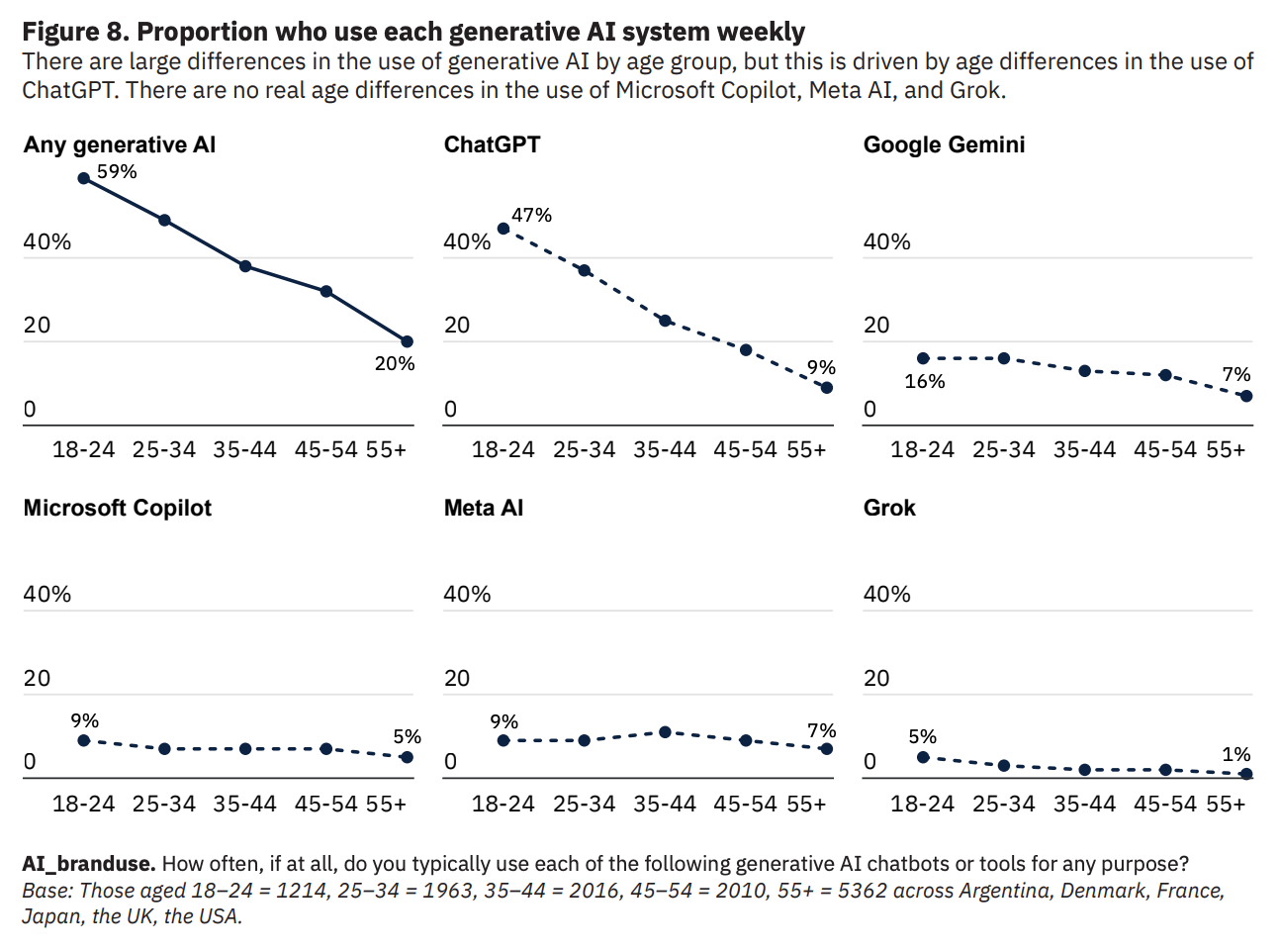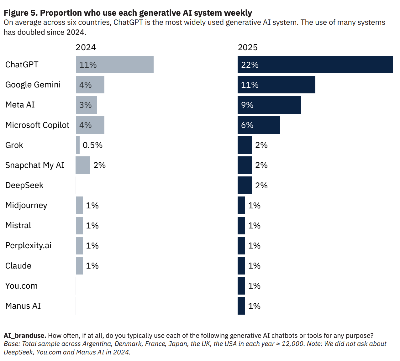 Niet geheel verrassend is ChatGPT nog steeds het populairst van alle systemen. Inmiddels gebruikt bijna een kwart van de mensen (22 procent) van de onderzochte landen het ChatGPT, gevolgd door Google Gemini (11 procent). Meta AI groeide van 3 naar 9 procent.