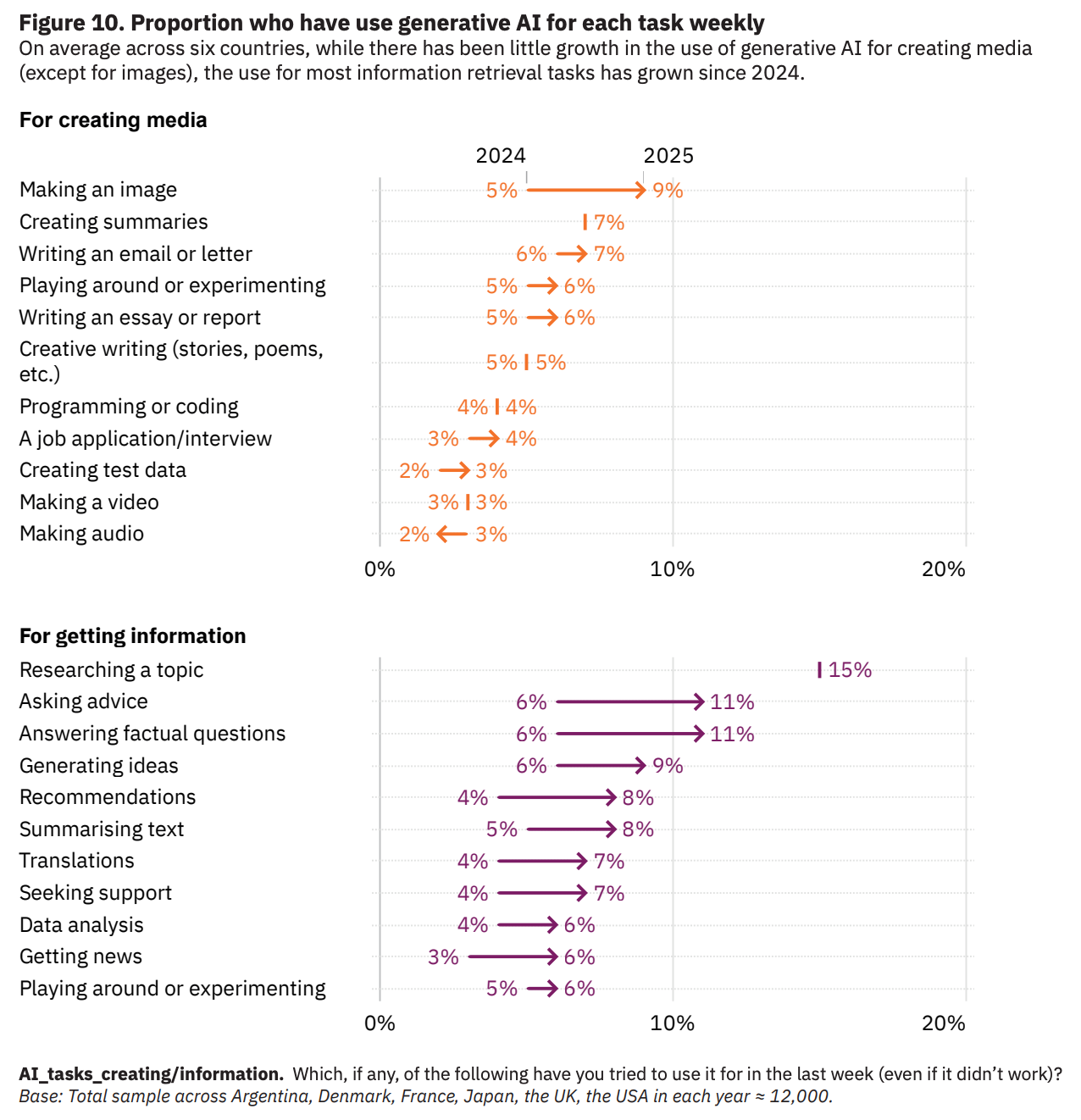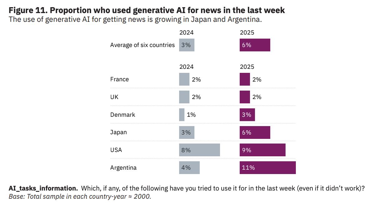 Als het gaat om het gebruik van generatieve AI voor nieuws is het verschil tussen landen overigens groot. In Frankrijk en het Verenigd Koninkrijk is dat slechts 2 procent en daar is er ook geen sprake van groei in het gebruik, terwijl in Argentinië het gebruik van generatieve AI voor nieuws bijna verdrievoudigd is.