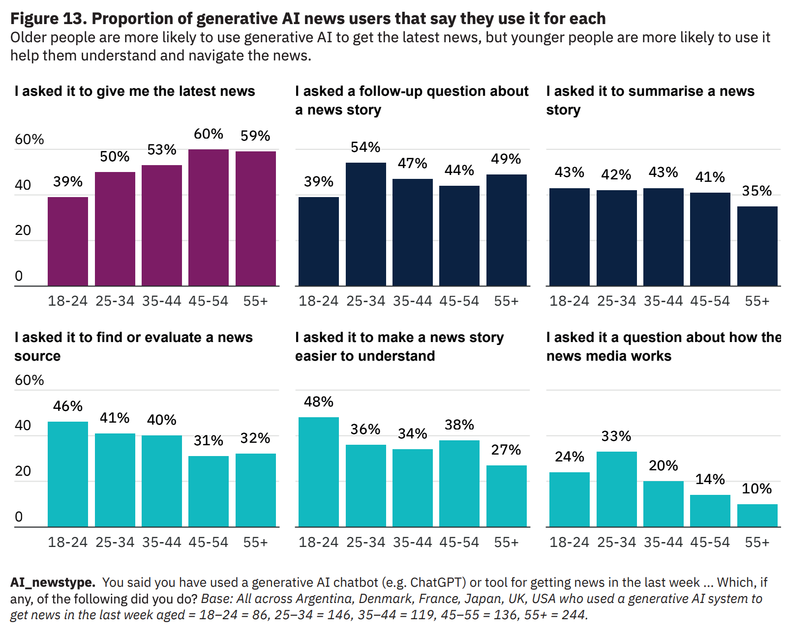 Als het gaat om deze toepassingen dan is er een duidelijk verschil tussen verschillende leeftijdsgroepen. Ouderen gebruiken generatieve AI relatief vaak om het laatste nieuws te krijgen, terwijl jongere groepen het veel meer gebruiken om het nieuws (en de bron) te evalueren.