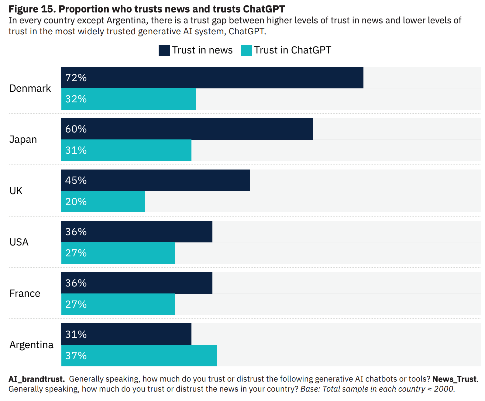 De onderzoekers hebben het vertrouwen in nieuws afgezet tegen het vertrouwen in ChatGPT en dan zie je grote verschillen tussen de zes onderzochte landen.