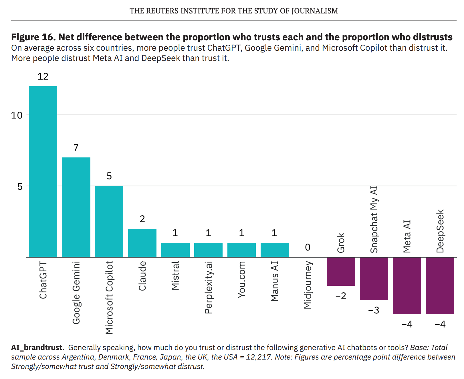 De onderzoekers hebben ook gekeken naar het vertrouwen in generatieve AI. Daarbij zie je dat de systemen die het meest worden gebruikt ook het meest worden vertrouwd op een belangrijke uitzondering na: Meta AI wordt door meer mensen gewanvertrouwd dan vertrouwd, terwijl het qua gebruik op de derde plek staat.