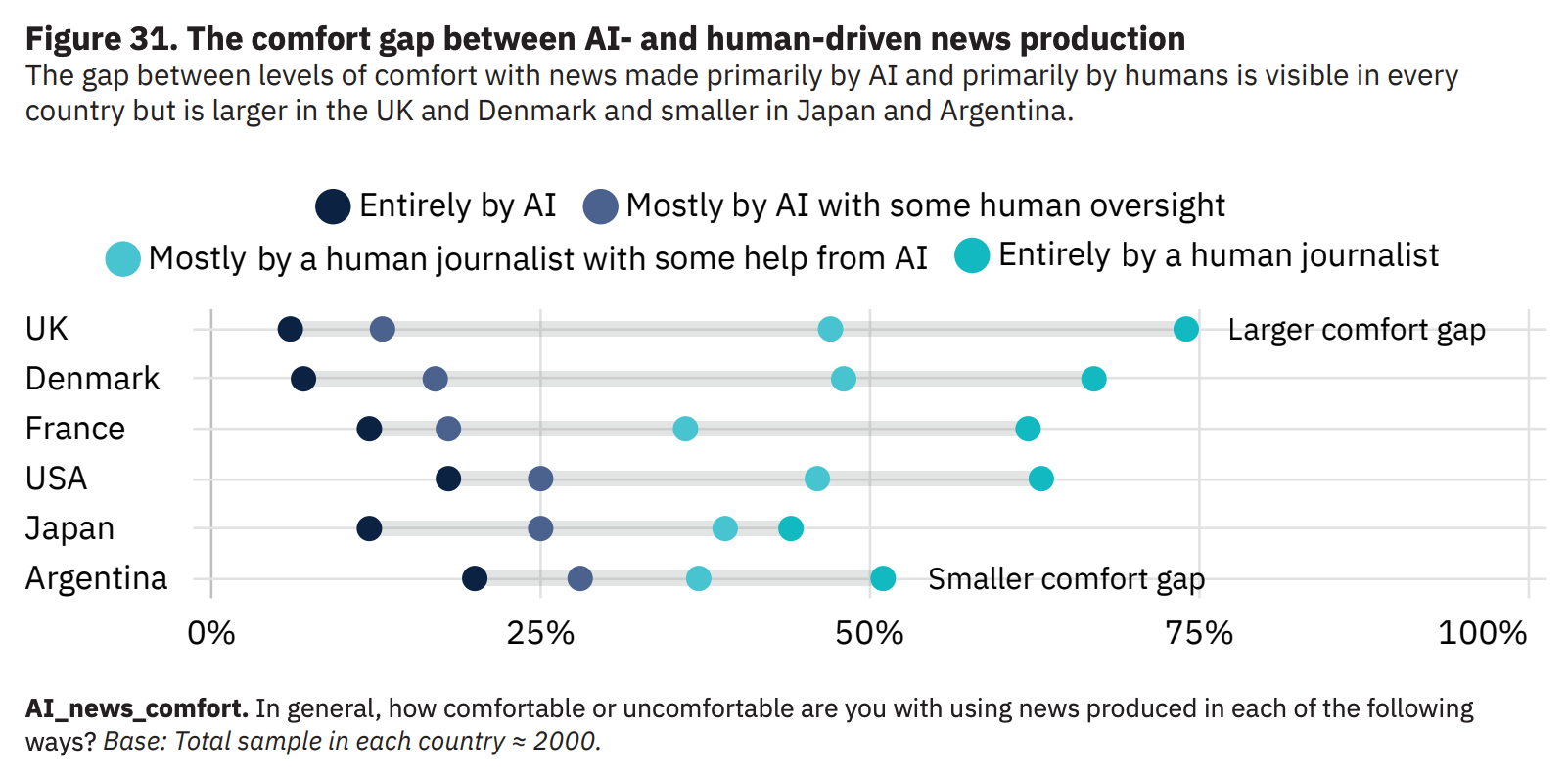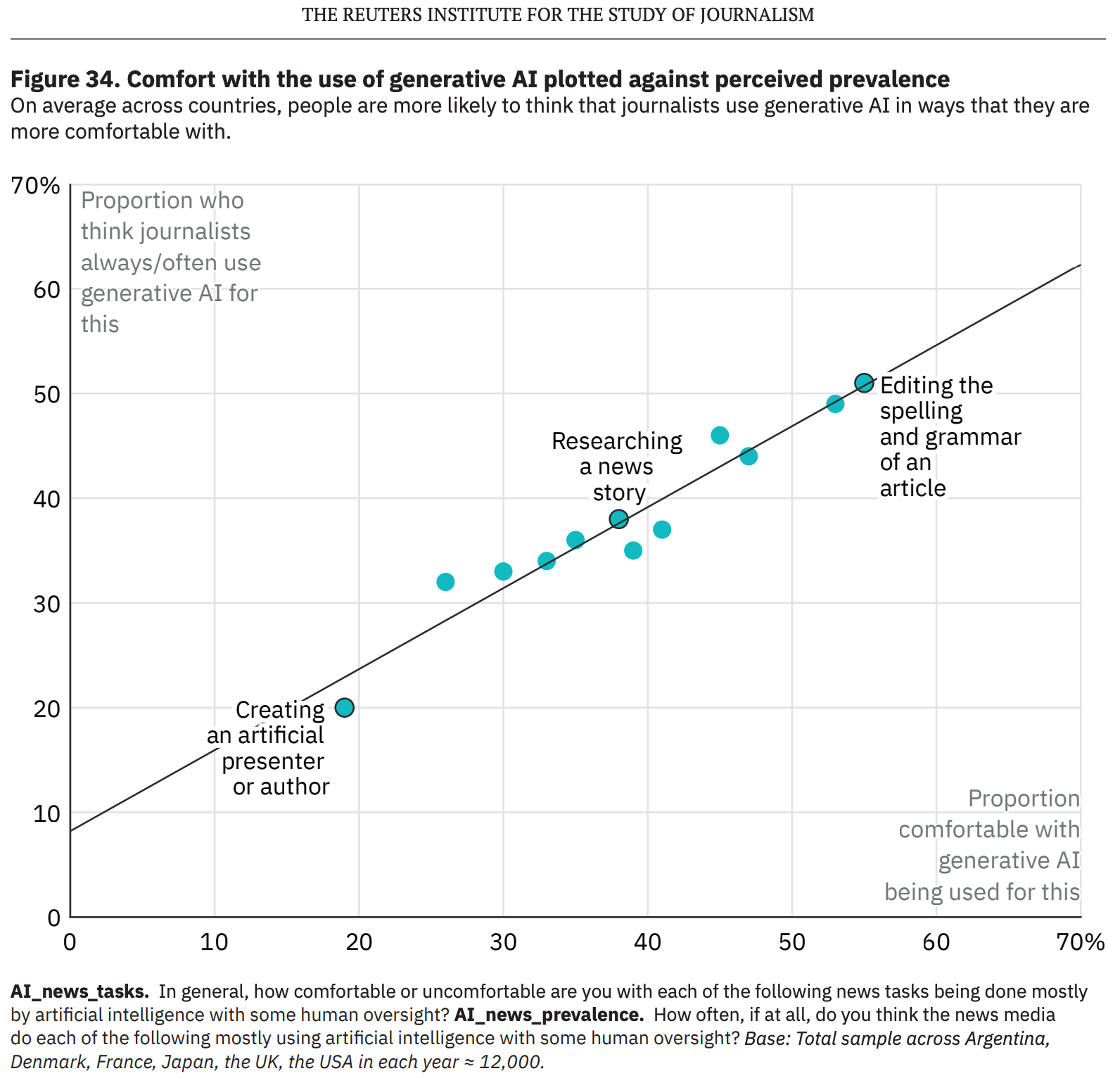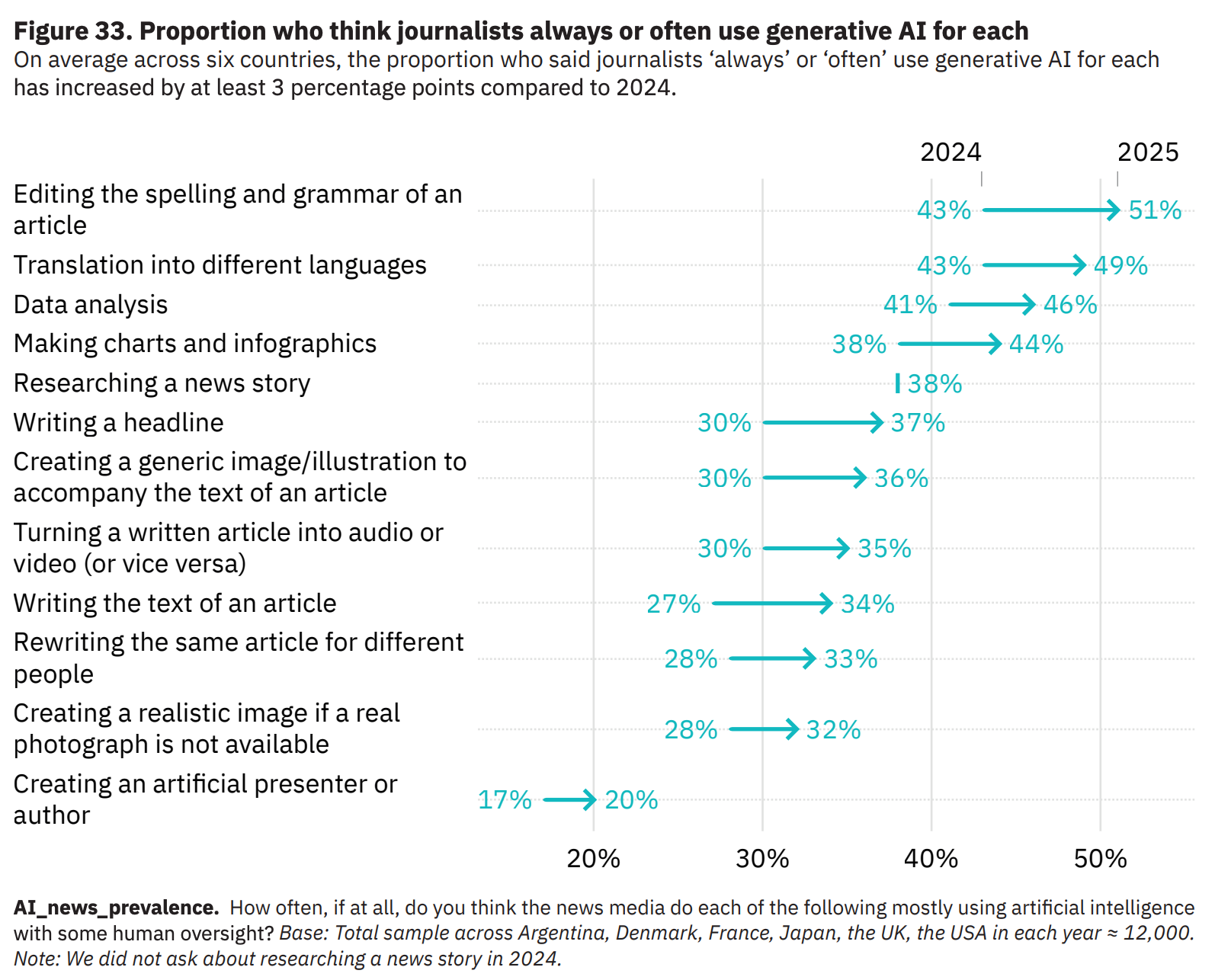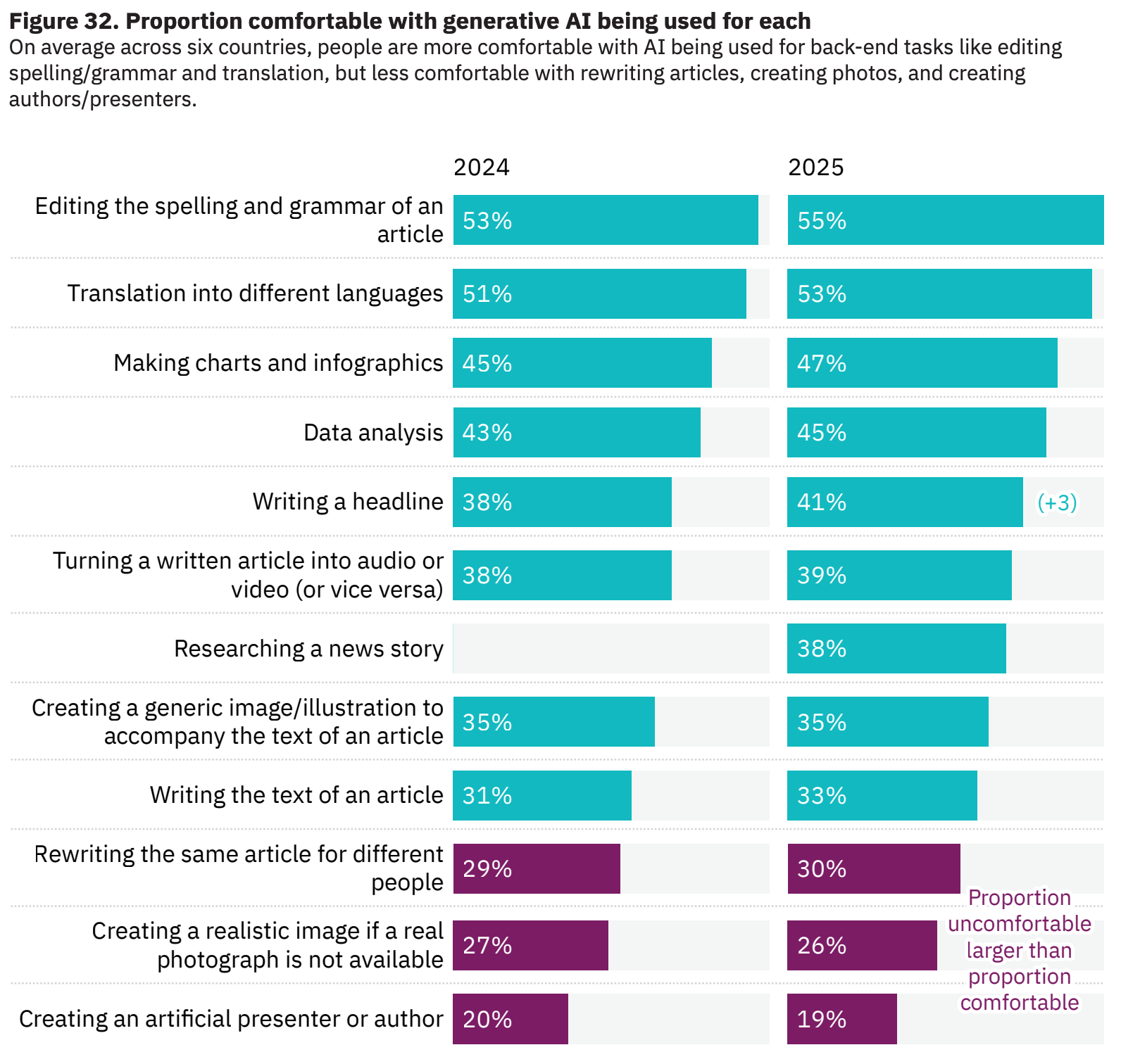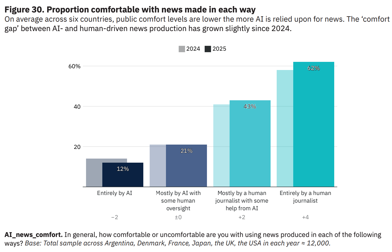 Het Reuters Institute for the Study of Journalism publiceerde in mei vorig jaar voor het eerst een onderzoeksrapport over hoe het publiek aankijkt tegen het gebruik van kunstmatige intelligentie in de journalistiek. Dit soort onderzoeken worden in mijn ogen pas echt interessant als ze niet eenmalig zijn, maar vaker worden gedaan, waardoor je in de cijfers trends en ontwikkelingen gaat zien. En gelukkig heeft Reuters dat gedaan, want deze week verscheen het 'Generative AI and news report 2025'.