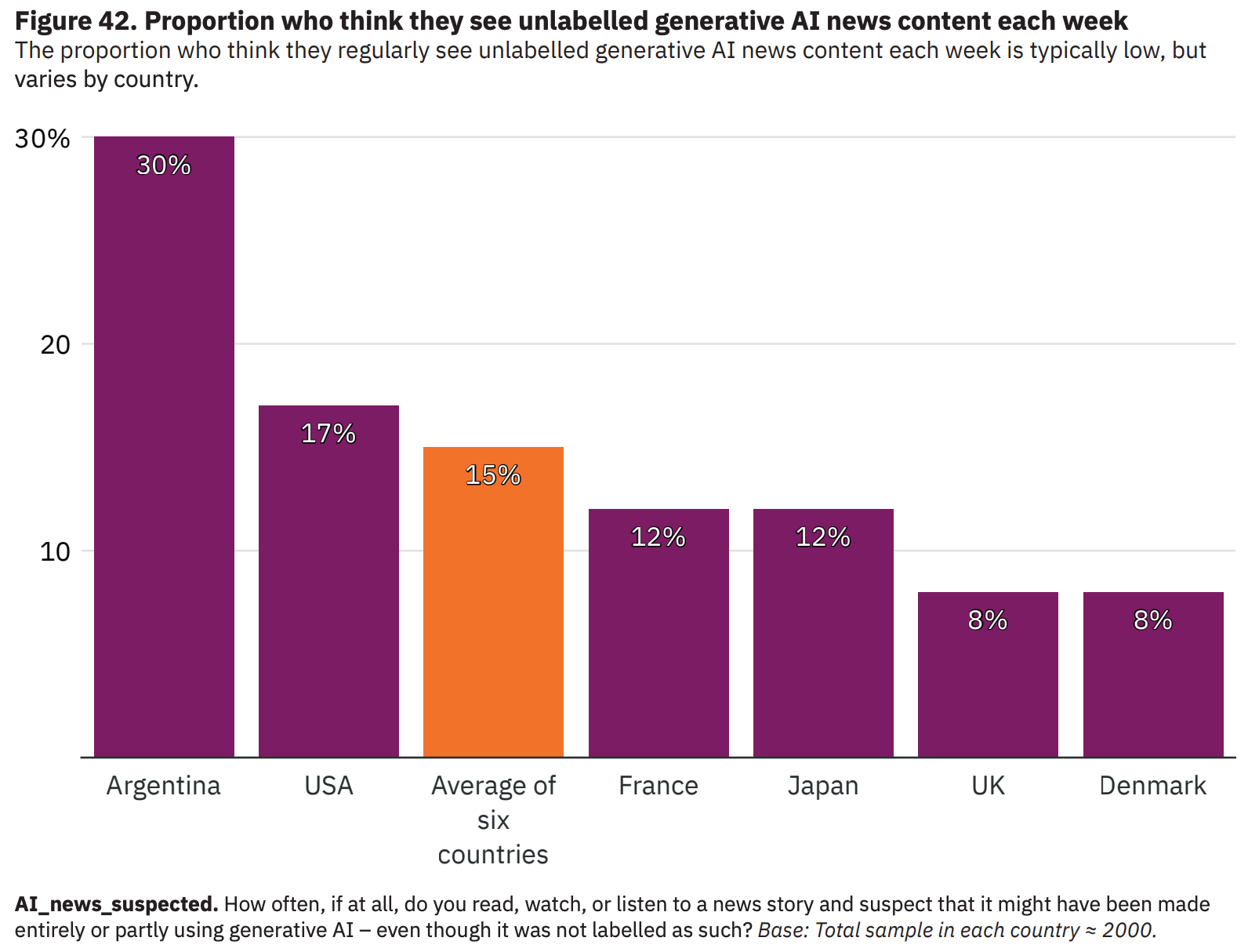 En tot slot nog één laatste grafiek: bijna één op de zes mensen denkt dat ze wekelijks nieuwsartikelen tegenkomen die zijn gegenereerd door kunstmatige intelligentie, zonder dat dit wordt vermeld. De vraag is natuurlijk bij wat voor nieuwsmedia ze dit denken te zien; dat is niet gevraagd.