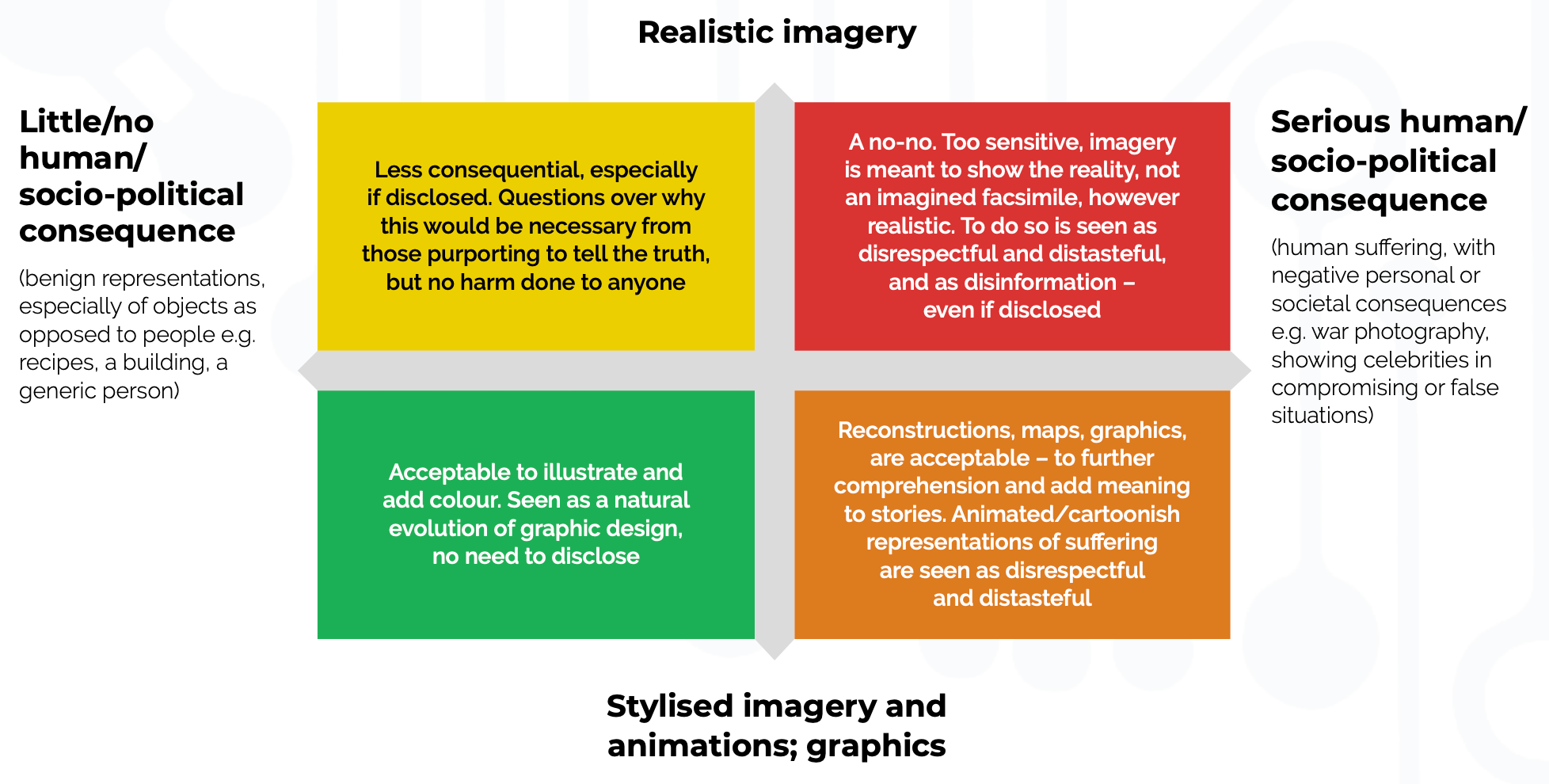 Vooral dat laatste is interessant: transparantie zorgt er niet voor dat het publiek het gebruik van generatieve AI voor foto's of video plots accepteert. Hoe duidelijk je ook maakt dat de media gegenereerd is, de houding blijft over het algemeen negatief. Uiteindelijk gaat het over hoe realistisch en 'serieus' het beeld is. De onderzoekers hebben hier een een matrix van gemaakt: