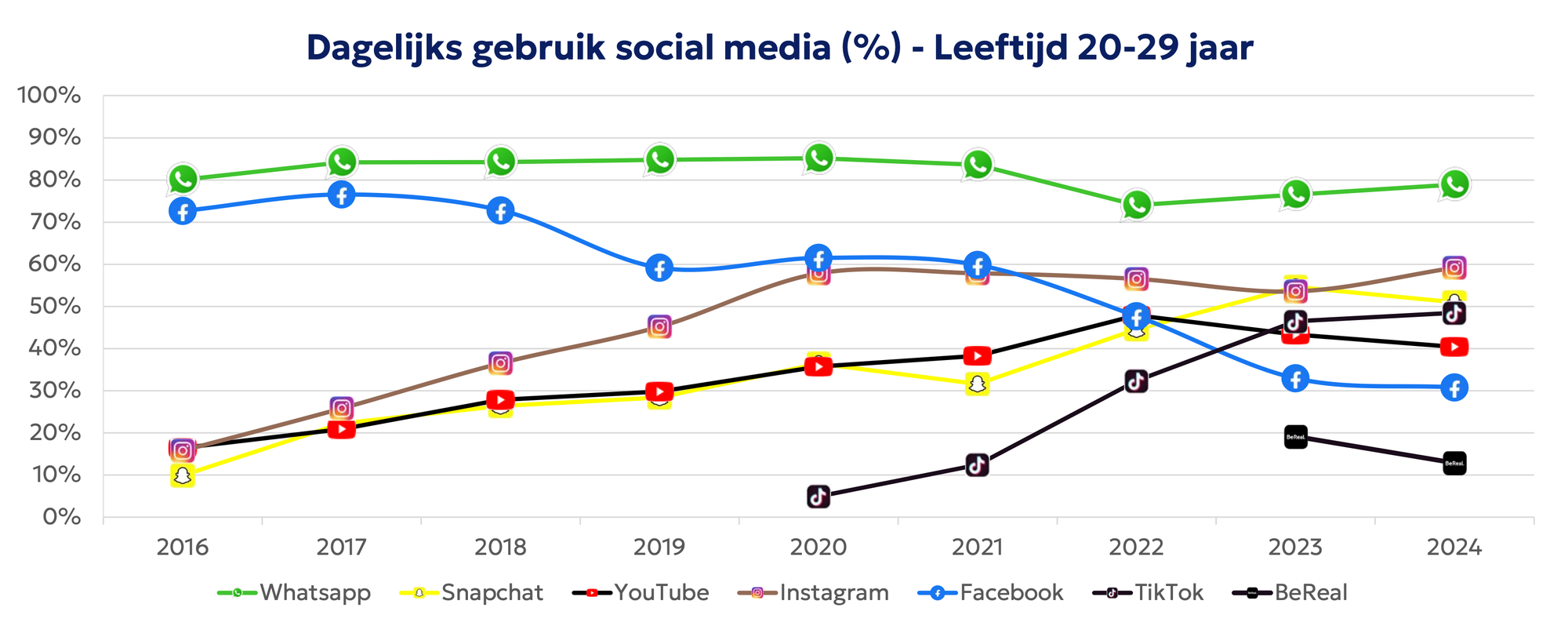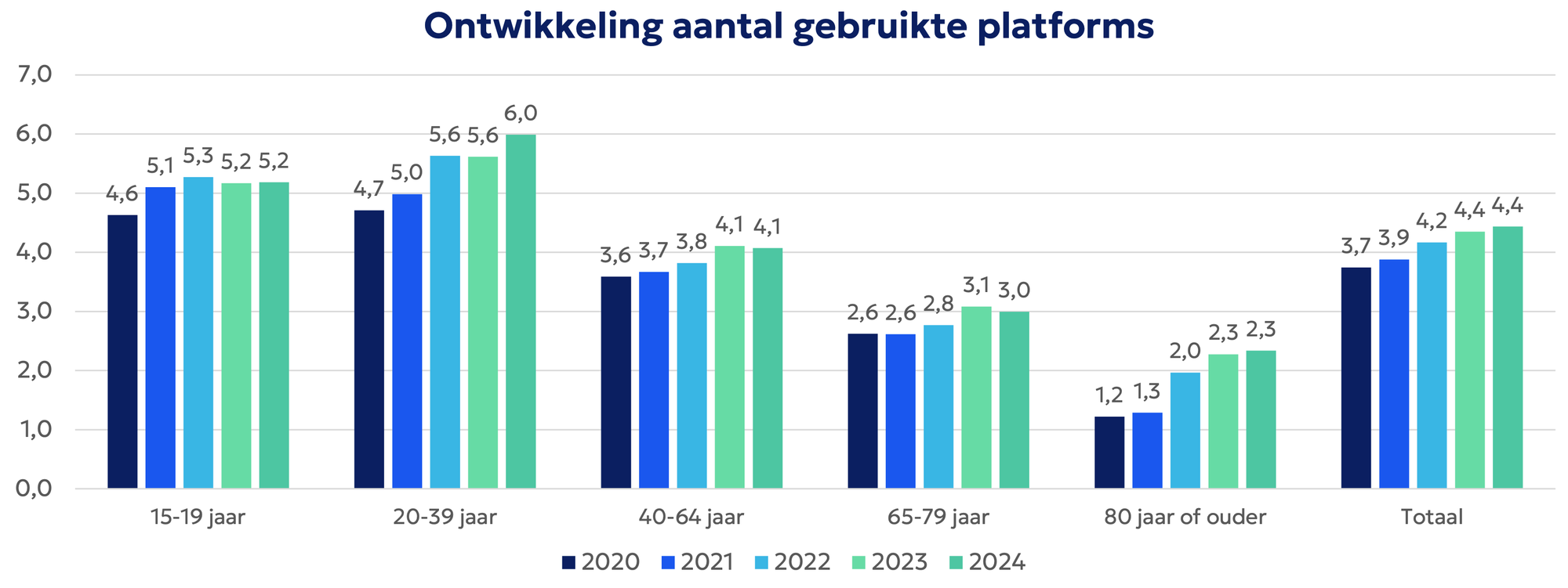 De afgelopen jaren is het aantal verschillende social-media-platforms dat Nederlanders gebruiken gegroeid, maar inmiddels lijkt het te stabiliseren. Behalve in de doelgroep 20-39 jaar. Zij gebruiken gemiddeld 6,0 platforms, tegenover 5,6 een jaar geleden. Daarmee scoren ze hoger dan elke andere leeftijdsgroep.
