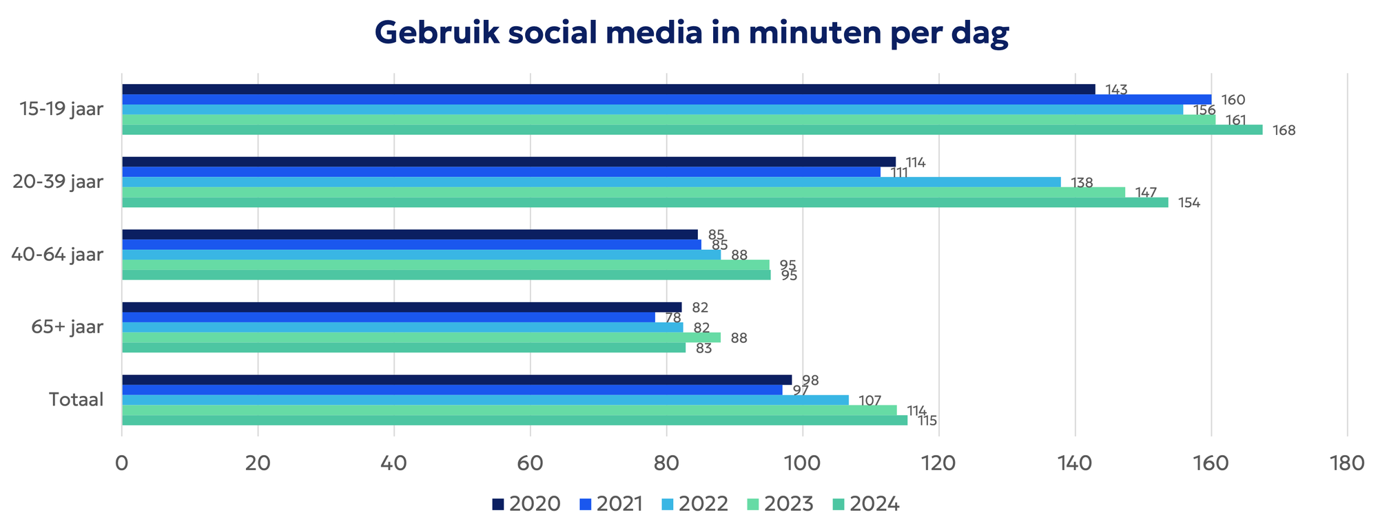 De hoeveelheid tijd die Nederlanders dagelijks op social media doorbrengen groeit overigens in alle leeftijdsgroepen, behalve 65+.