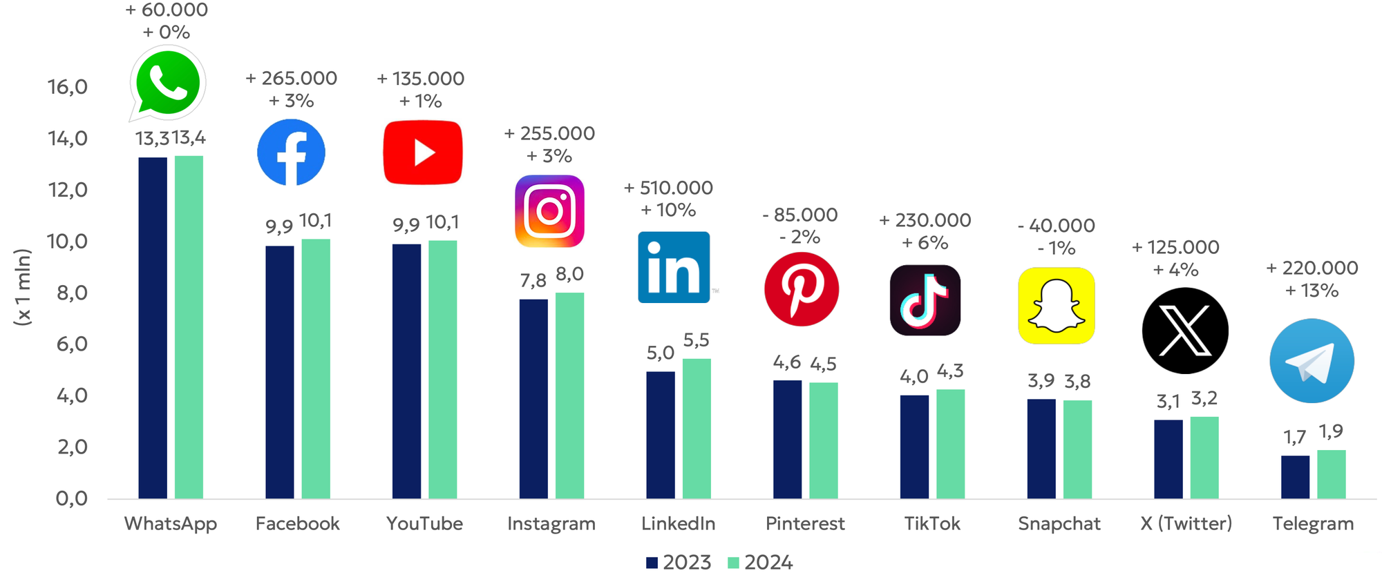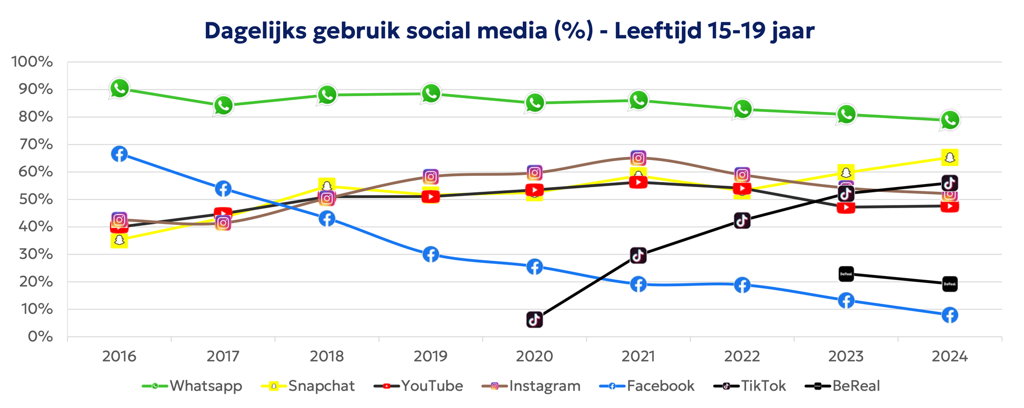 Het dagelijkse gebruik van Instagram is in de groep 15-19 jaar dit jaar gedaald ten opzichte van 2023, terwijl TikTok juist meer wordt gebruikt. Hierdoor is TikTok nu groter dan Instagram in deze groep.