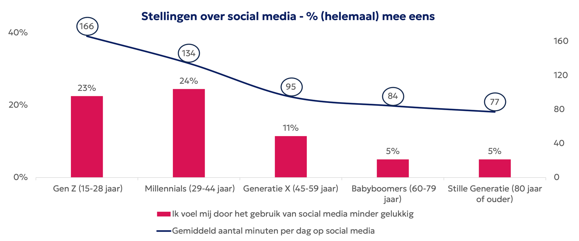 De onderzoekers hebben ook gevraagd naar de invloed van social media op het mentale welzijn. Daarbij zie je dat bij de jongere doelgroepen bijna een kwart zegt dat ze minder gelukkig zijn door het gebruik van social media.