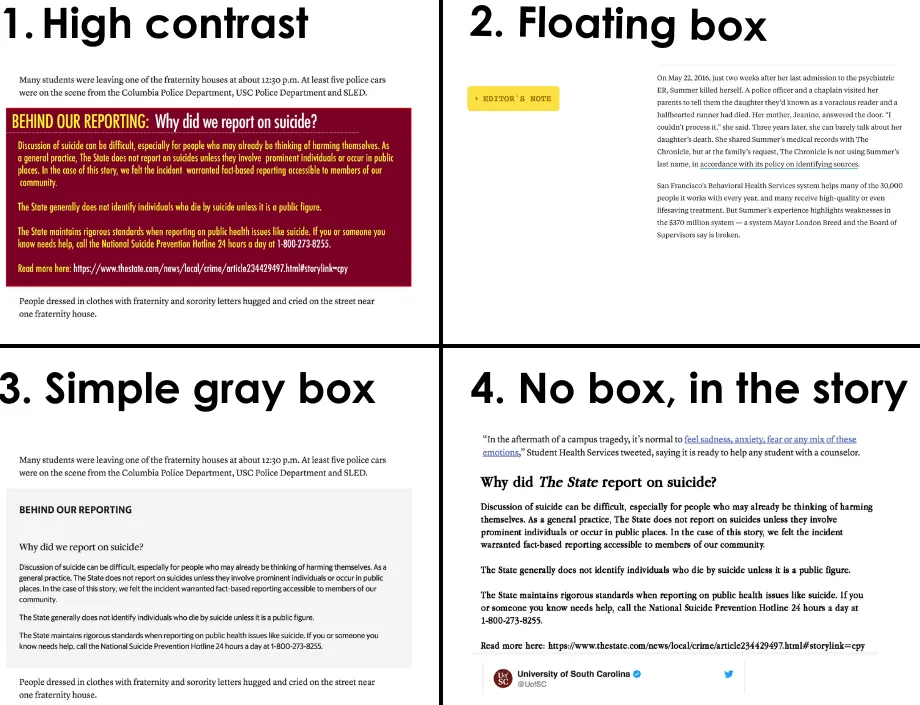 In this study, users who read the transparency information were more likely to believe the article was reported ethically and that the news organization could be trusted to ethically report on suicide in the future. But those feelings of increased trust were not a whole lot higher than those who did not read the contents of the transparency boxes. So we definitely need more research on the impact of the information, not just the design options.
